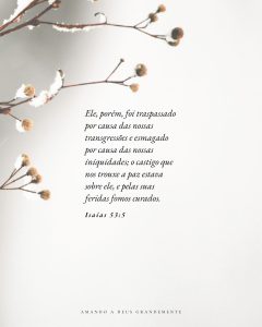 Seu castigo trouxe a nossa paz (embora o castigo fosse pelos nossos pecados, somente Jesus o suportou). Efésios 2:13-14 nos lembra que fomos aproximados de Deus pelo sangue de Cristo, que é a nossa paz.
